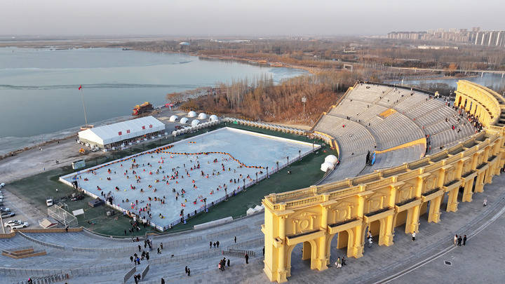 从春节前夕开始,览山公园的“落日冰场”就格外热闹。约8000平方米的冰面一侧是高台之上的罗马柱建筑,另一侧是波光粼粼的阅海湖与巍峨绵延的贺兰山。夕阳洒下金辉,冰场上“财神”“小动物”与游客欢乐互动,“冰上小火车”满载笑声穿梭——这里不仅是冰雪乐园,更是一幅生动的落日画卷。
