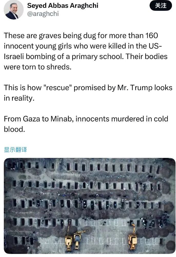 美国和以色列对伊朗发起联合军事打击,不仅导致地区局势急剧升温,更酿成了惨痛的人道主义灾难。2月28日,伊朗南部一所小学遭空袭,至少165人遇难,其中大部分是儿童。一张遗体下葬的照片在网上流传。有人说,这是美以对伊朗动武以来,最让人心碎的一张照片。